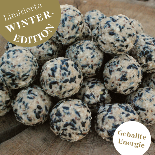 - Meisenknödel klassisch: üppig mit schwarzen Sonnenblumenkernen gespickt. Die Sonnenblumen dafür werden auf ökologisch bestellten Feldern in Deutschland angebaut.